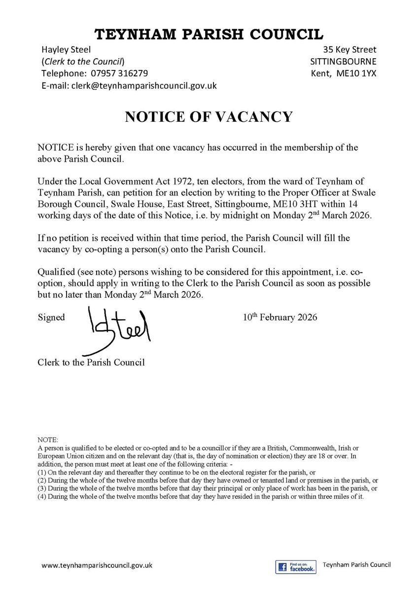 Notice is hereby given that two vacancies have occurred in the membership of Teynham Parish Council.